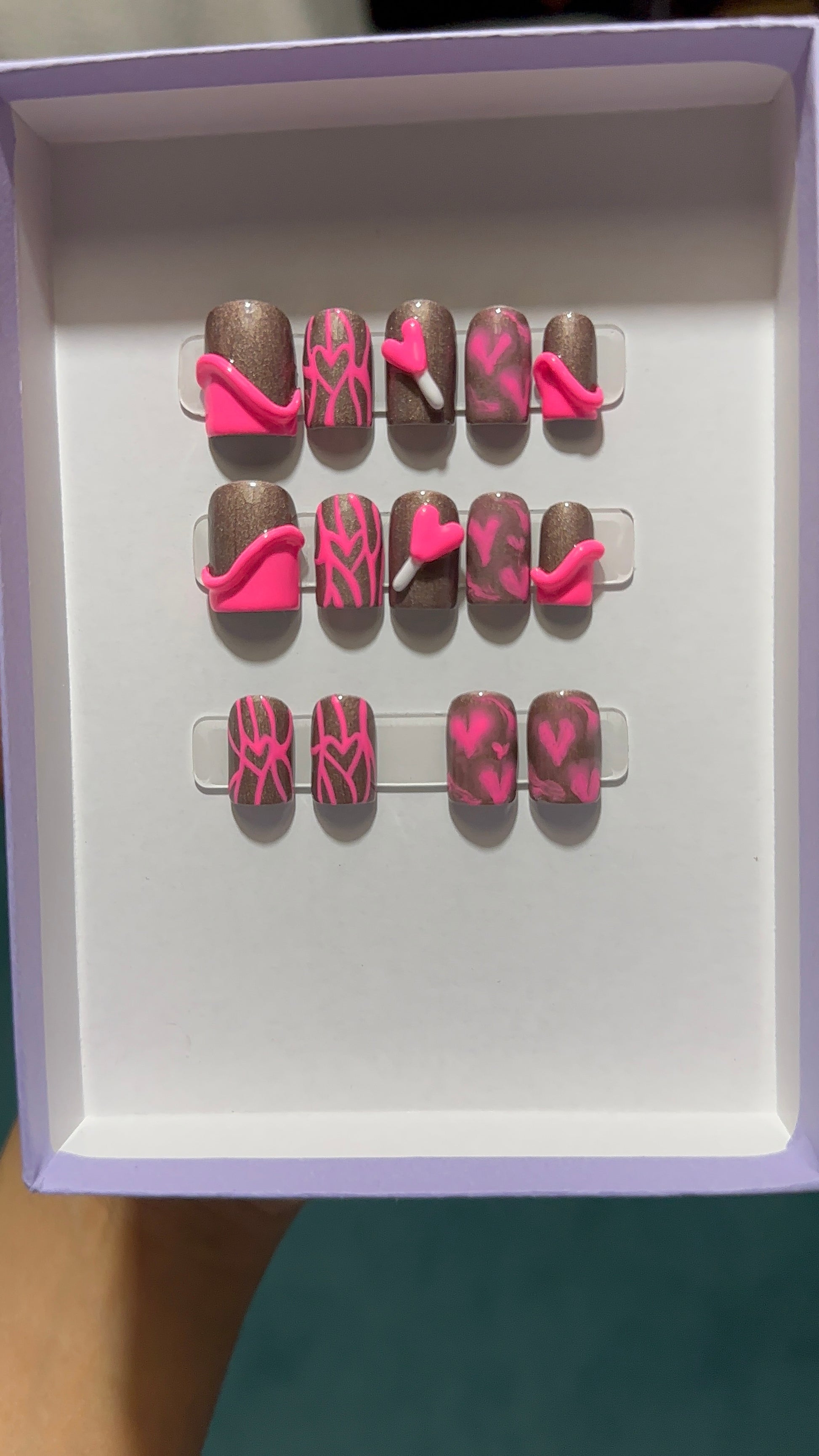 Get ready to fall in love with our 'Be Mine' press-on set. These short square nails feature a glossy metallic brown base with bold hot pink nail art, which includes 3D designs and playful heart motifs. No need to wait for Valentine’s Day, these nails are ready to show off any day!