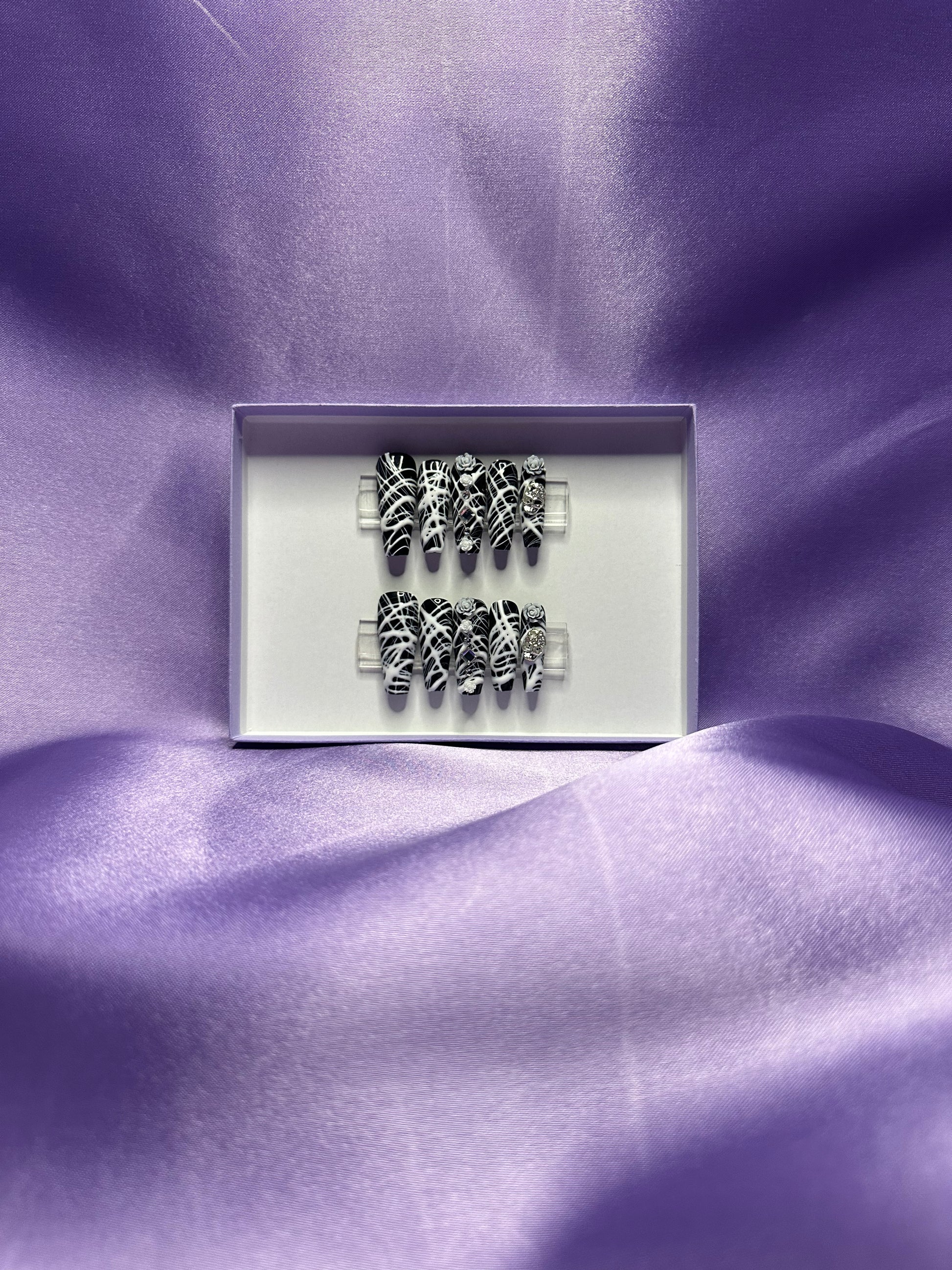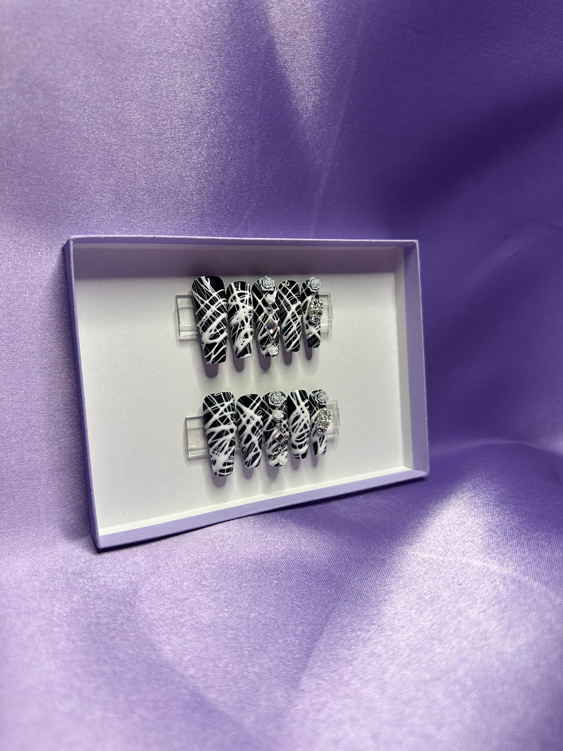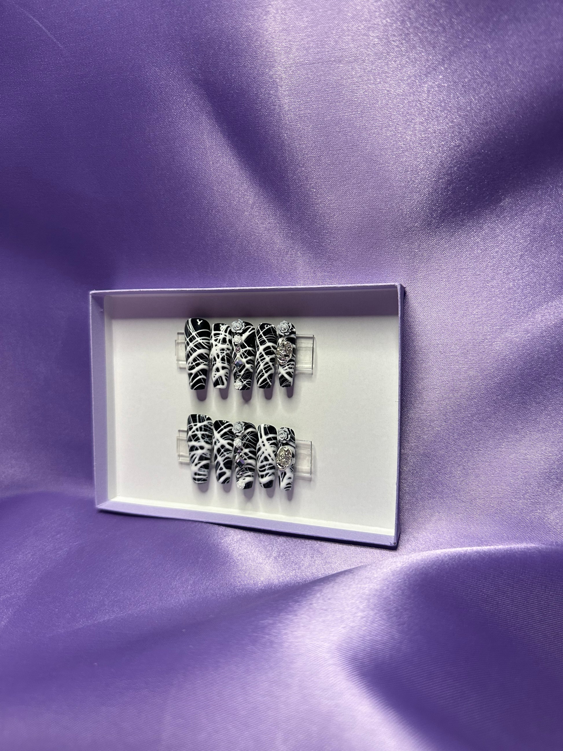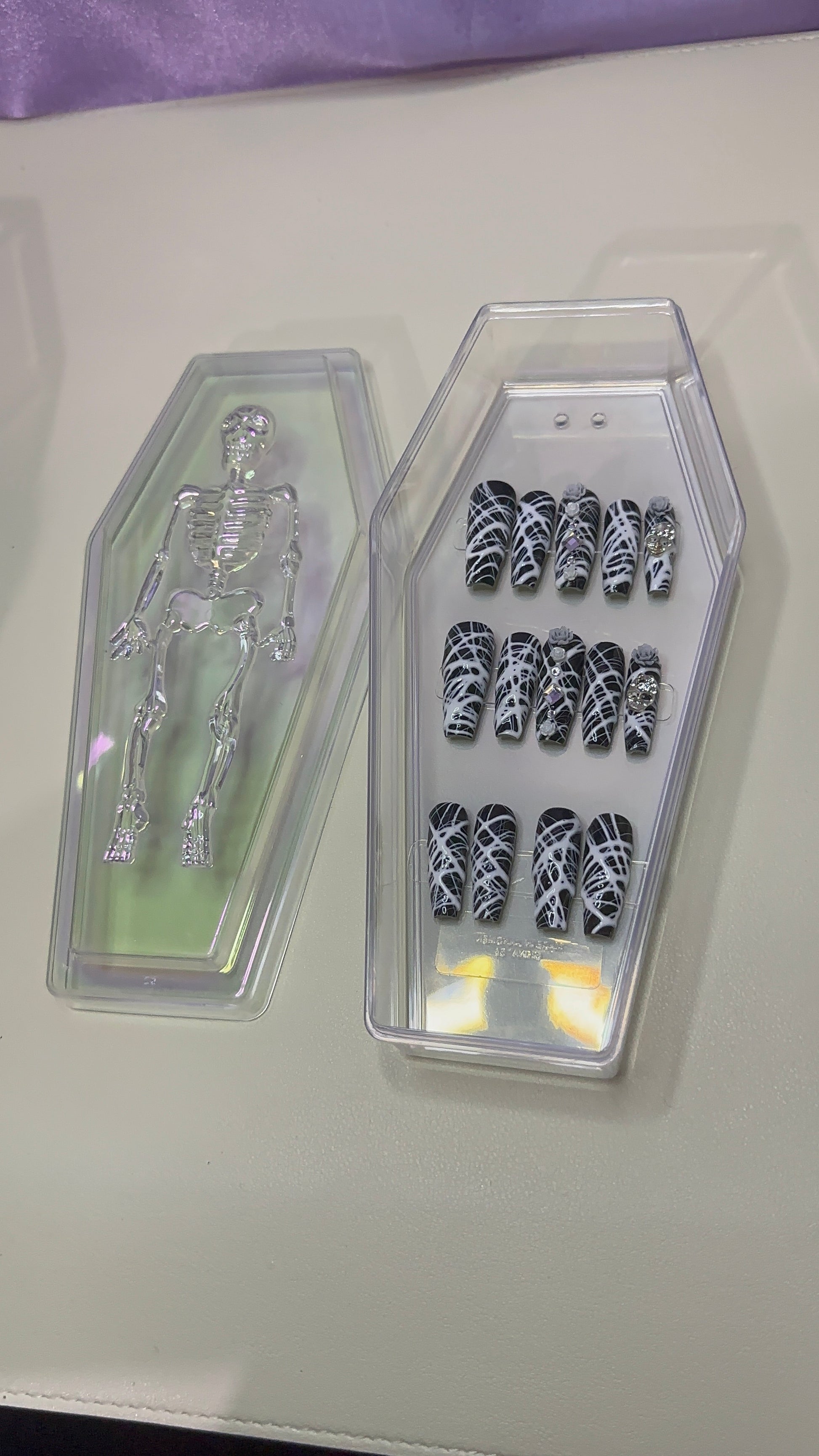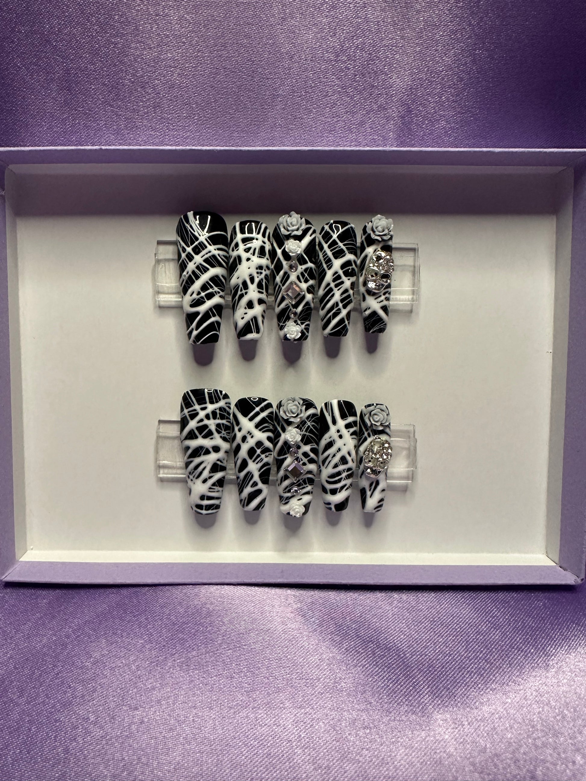 Step out of your comfort zone with our daring Halloween press on nail set. The striking black background perfectly complements the intricate design, featuring bold white spider gel and shimmering silver rhinestones. To add a touch of edgy elegance, we've included charming rose and skull embellishments. Unleash your inner risk-taker and make a statement with these unique nails! *comes with coffin case
